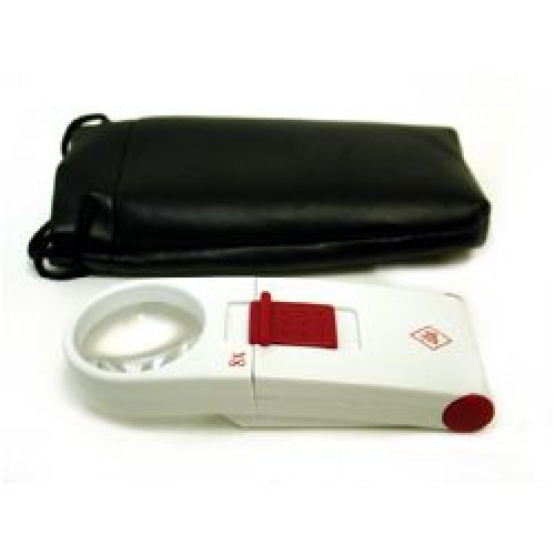 Distortion-free magnification with LED light, which is bright and relatively cool, make this 8X magnifier an outstanding aid for reading. The lens is a good size 1.4 inches in diameter and it is economical since the batteries used with the LED bulb last 10 times longer than with conventional bulbs. Comes with a protective drawstring vinyl pouch. Operates on 3 AAA batteries, not included.
